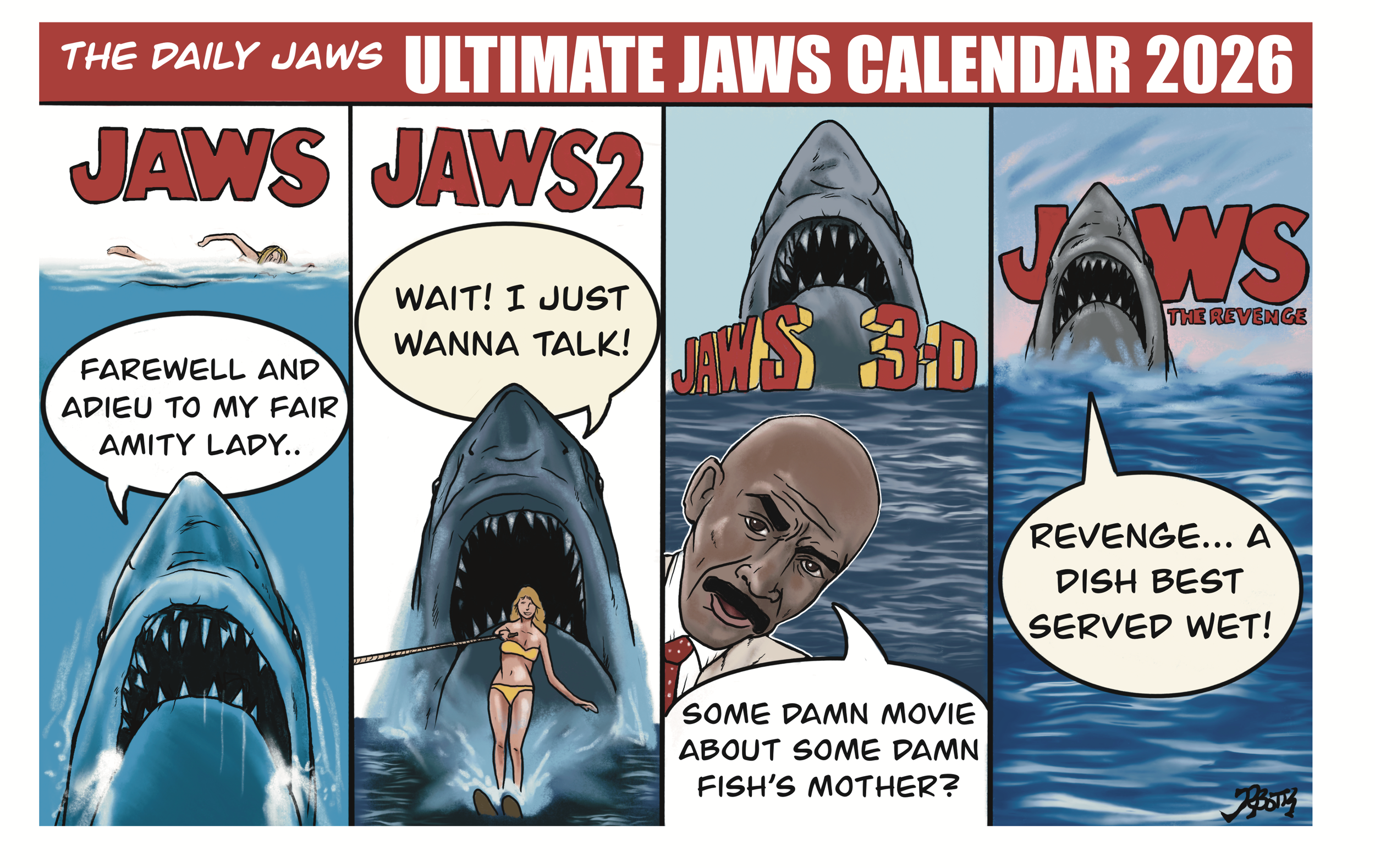 This limited-edition calendar is perfect gift for every JAWS and film fan to enjoy every day of 2025. Bursting with 13 exclusive and original hand drawn artwork by RobBottsTOONS as well as key JAWS dates to commemorate throughout the year.