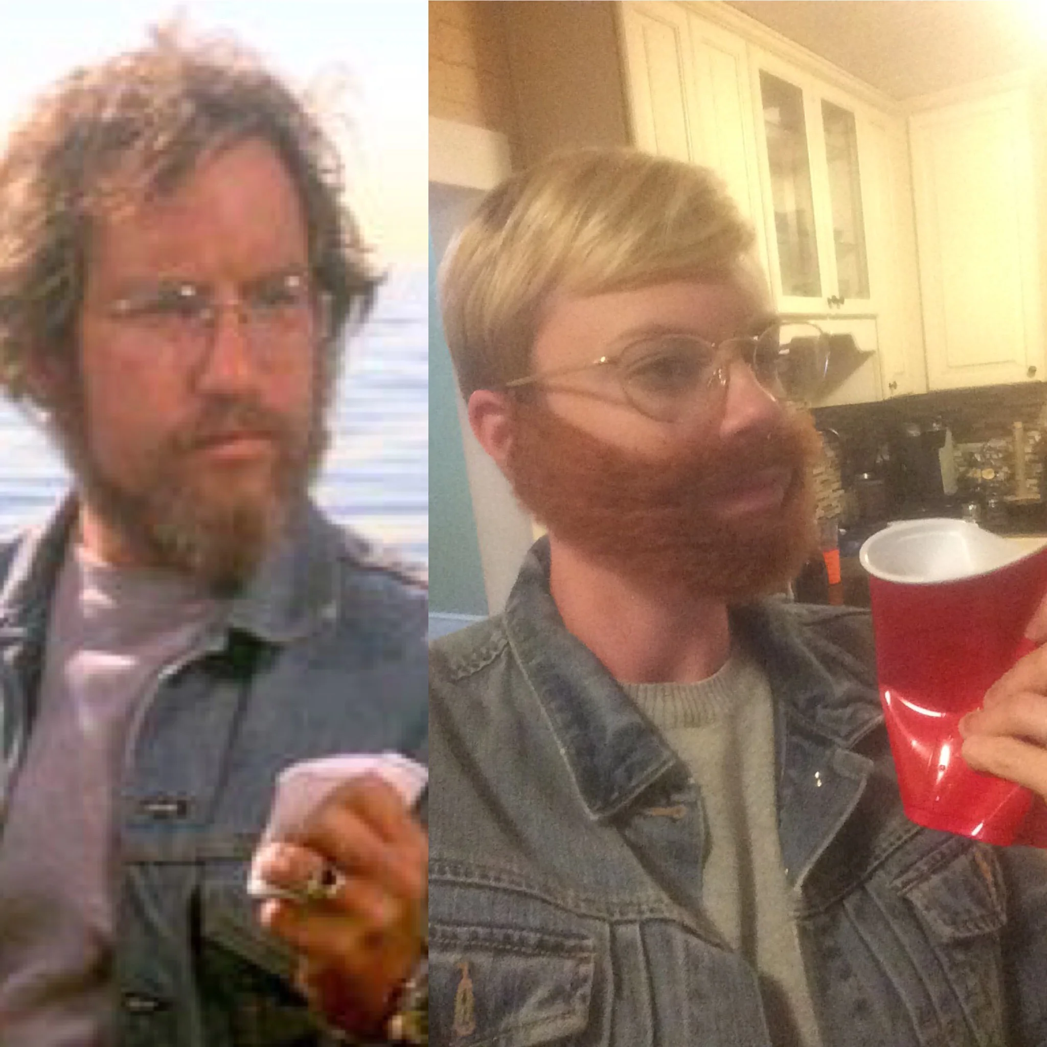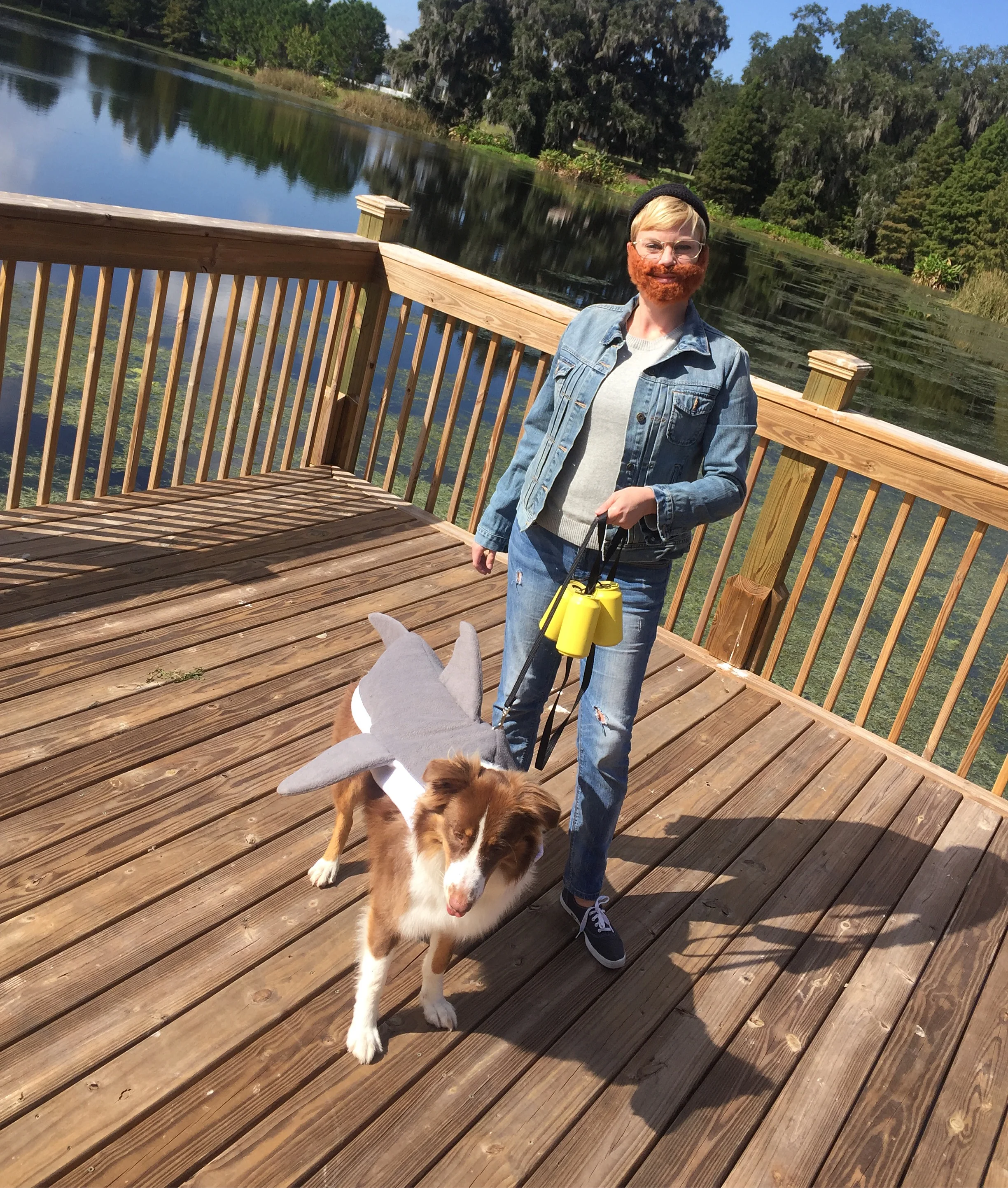 For Halloween 2016 I patterned and constructed a Bruce costume for my Australian Shepherd, Daisy - there is even a pocket in the back where we tuck her tail so the shark tale waves back and forth as she walks. I crocheted a beard and cap for my Hooper costume and spray painted 3 beer can "barrels" as well.