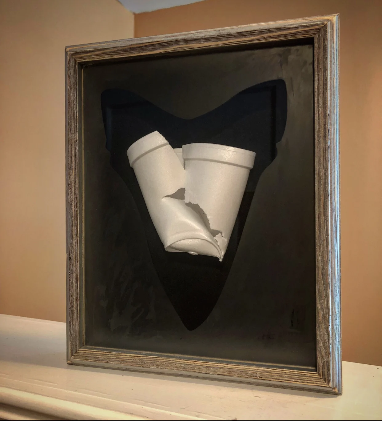 When I met Richard Dreyfuss he commented on my dress - that it was clever and he'd never seen one like it (and I died, obviously) and then I clumsily pulled 2 Styrofoam cups out of my purse and asked if he would recreate that moment with me for our photo. He laughed loudly and told me that in all the years he's been meeting fans, I'm the first one to ask him to crush a cup. As evident in the photo, I lost every bit of chill that I had. I thanked him, he handed me his cup, and I promptly put it in the safest place I could think of - I built a shadowbox frame with a giant shark tooth (not quite shot glass sized - Styrofoam cup sized) etched into the glass.