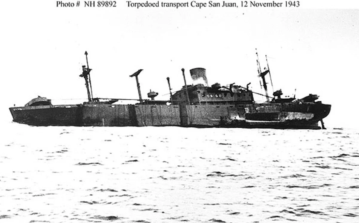 That fate befell many of those on board the Cape San Juan, a 6711-ton US freighter and troop transport ship. On November 12, 1943 it was torpedoed by Japanese submarine in the Pacific Ocean near the Fiji Islands.