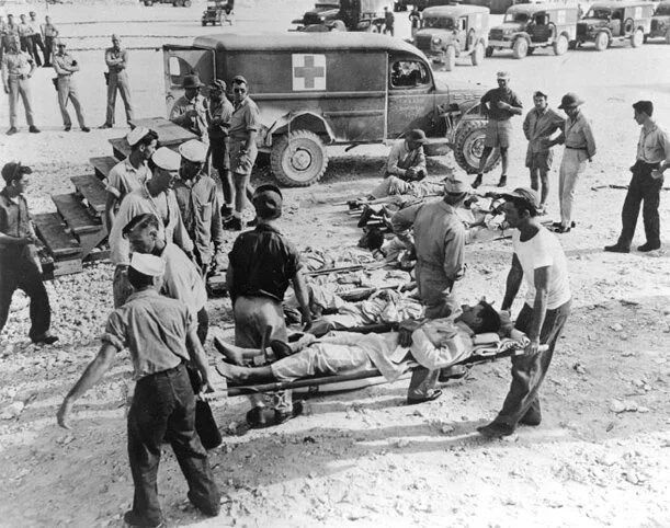 Survivors of the USS Indianapolis are taken to medical aid on the island of Guam