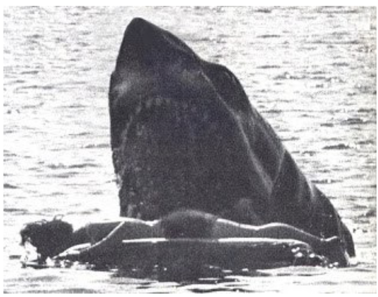 A screenshot from one of these videos show how the shark is ”dragging” the boat, its teeth lodged into its side. The eyes are clear white, just like Quint described how a shark reacts while in a feeding frenzy. ”When he comes at ya, doesn't seem to be livin'... until he bites ya. And those black eyes roll over white, and then... oh, then you hear that terrible high-pitch screamin.'”