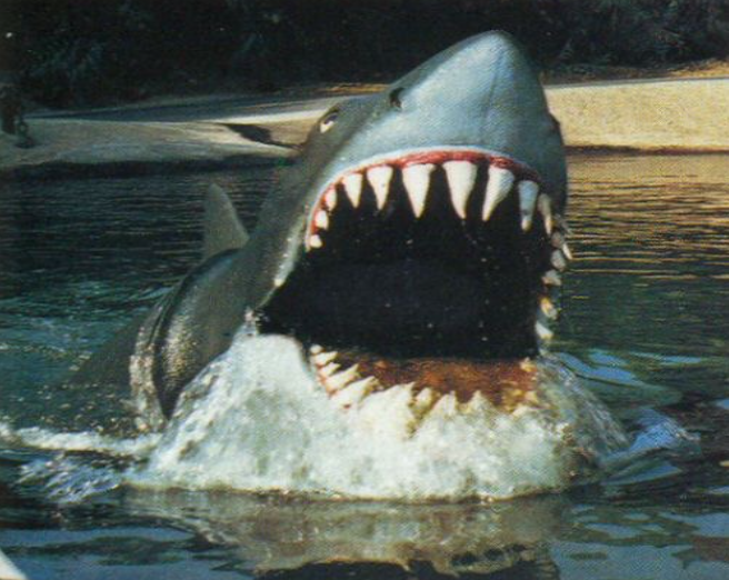 ”Realism” didn’t seem to be the height of importance for this ride, as we can see from this image. The teeth are long and crooked enough to make me more concerned for the sharks dental plan than anything else. But don’t worry, his...dentures (and the rest of his appearance) was changed a total of three times during the attractions existence). None of them quite lived up to the same quality of Bruce from the first film, but they do have personality…
