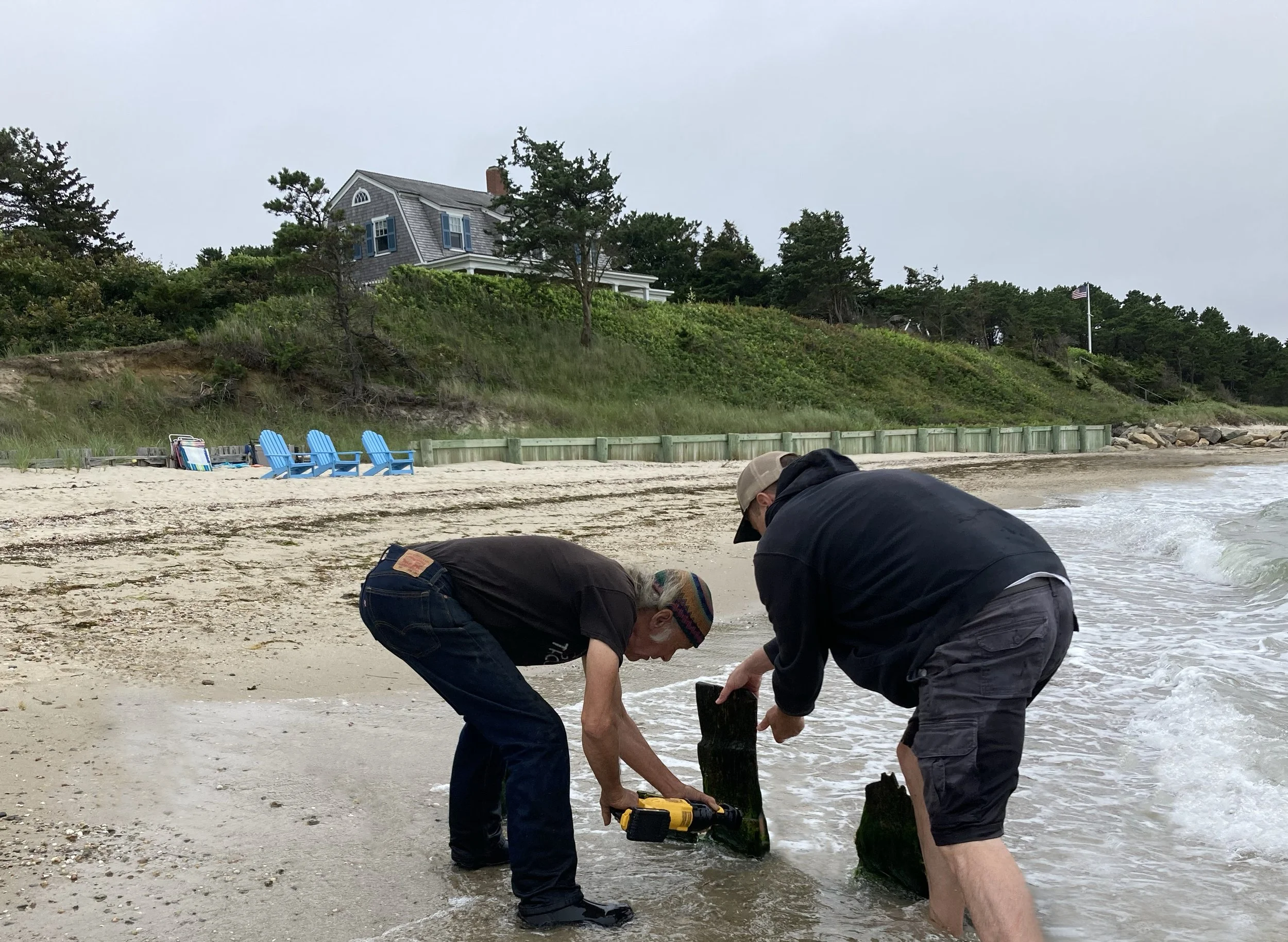Author Matt Taylor and Jaws set carpenter Eric Ropke remove the remains of "Charlie's dock" from the Martha's Vineyard beach where the scene was shot.