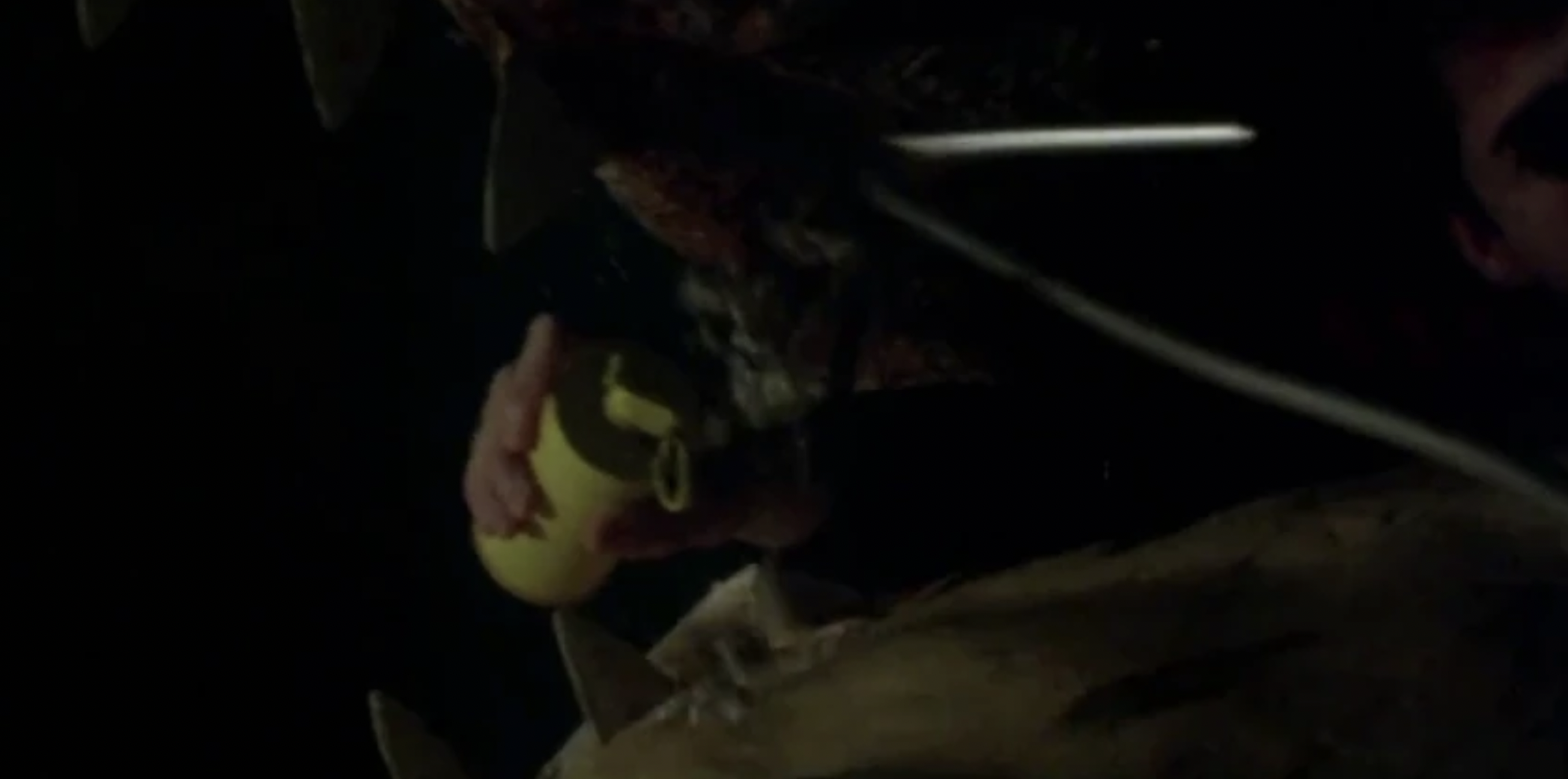 This tradition of foreshadowing the shark’s fate is carried through in the next two Jaws sequels. In Jaws 2, Hendricks pulls up the power cable while out searching for evidence / remains of the missing water skiier. Entrepreneur Calvin Bouchard specially tells Philip Fitzroyce and Jack Tate “No grenades.” when they are about to try and catch the trapped baby Great White. The 35ft long “damn shark’s mother…” is killed by a grenade held in the hand of a part digested Philip Fitzroyce.