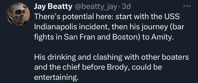 Personally, I think a prequel about Quint on the USS Indianapoolis isn’t necessary as Robert Shaw’s writing and performance of the speech is as good as screen acting gets and doesn’t need anything more adding to or potentially taking away from it. Seeing how Quint initially coped with his apparent PTSD and survivor’s guilt and his building a life and business on Amity Island is a gap in his story that could be interesting to see.