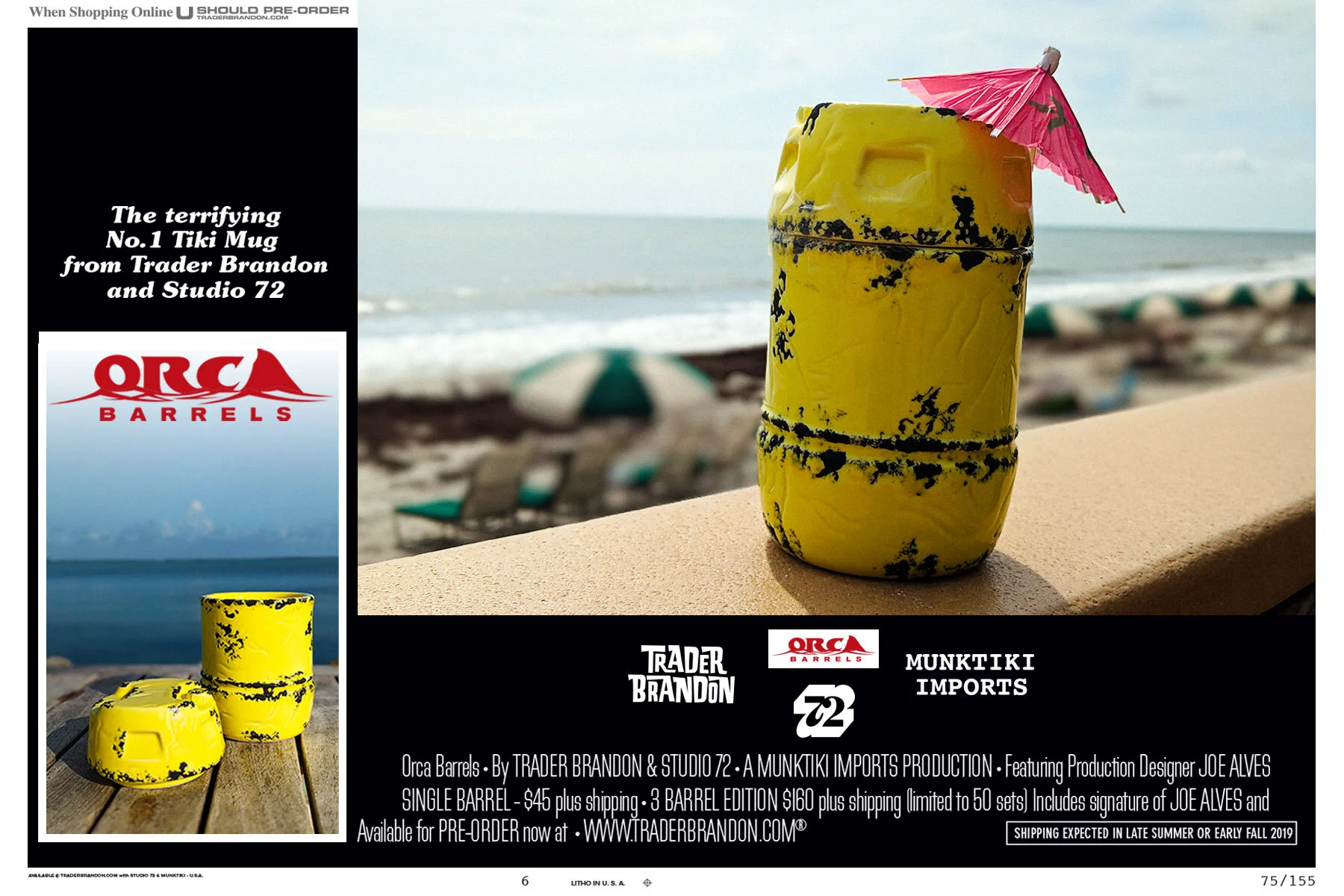 A NEW TIKI MUG FROM TRADER BRANDON AND STUDIO 72 From Trader Brandon and Studio 72 comes the definitive rum barrel. Perfect for all seafaring adventures. Measuring 5" tall and holding 6oz with ice, and a "missing cap" hole perfect for your straw!