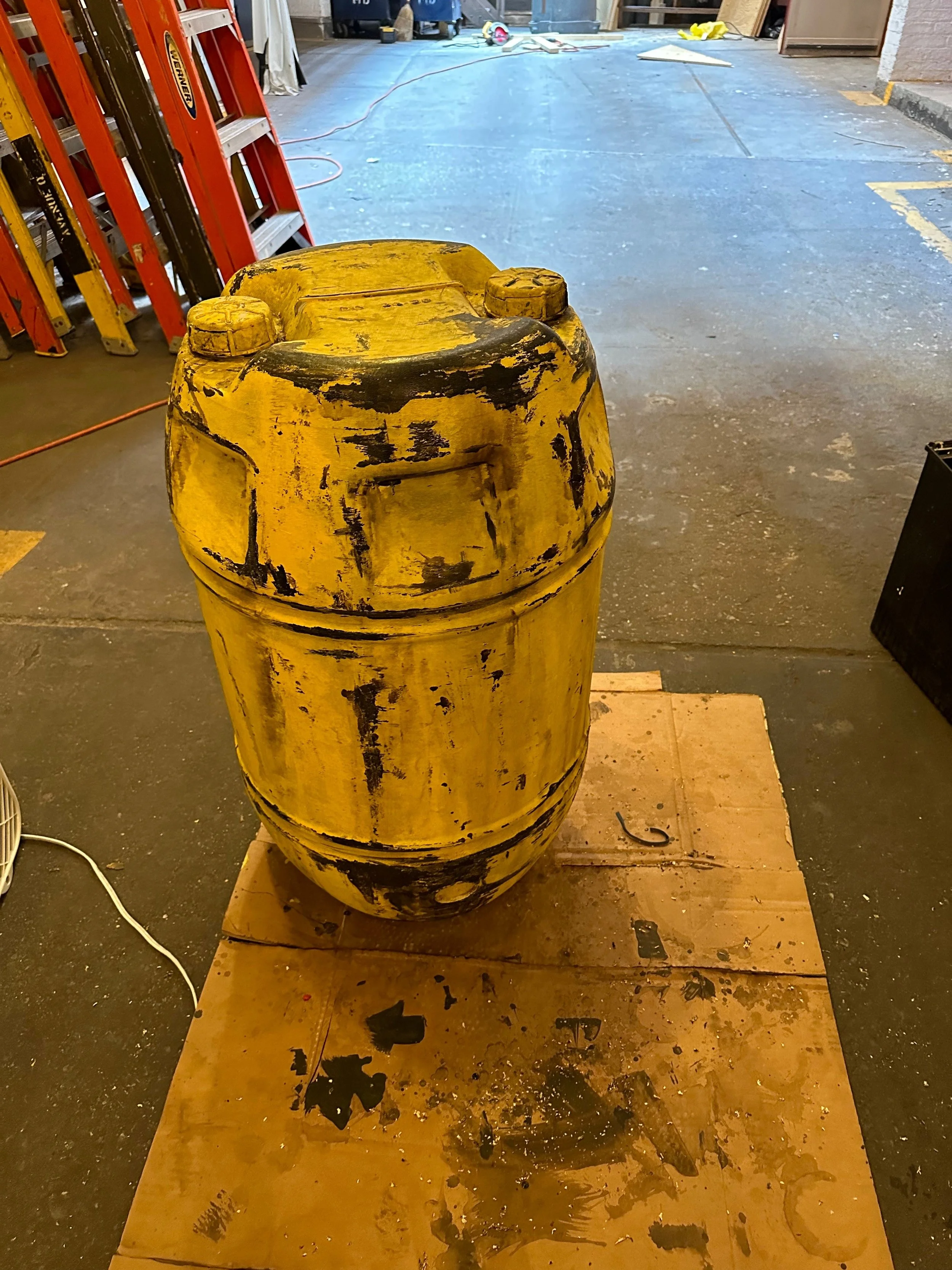 ROBERT: I brought in a packet of photos and information to help speed along the plays art department in transforming our barrel from being in it's original state of black hard plastic to the iconic distressed bright yellow as seen in the film. Prior to bringing the piece in there was question asked by production about them altering the barrel by painting it up. Did I mind changing it from its present state? It was a no brainer in my eyes. This would only raise the station of this lowly worker bee prop to an integral piece of JAWS canon!