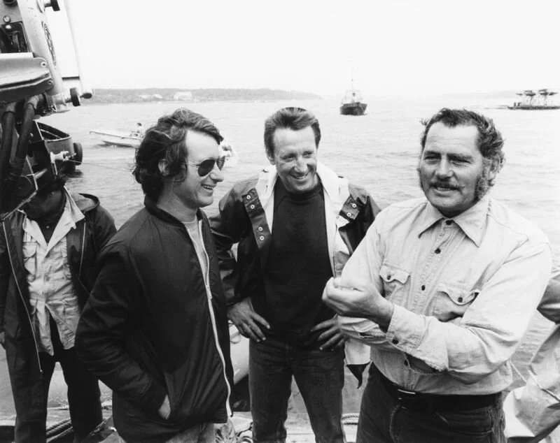 Spielberg (middle) with Jaws production designer Joe Alves (right) going through Bruce’s lines