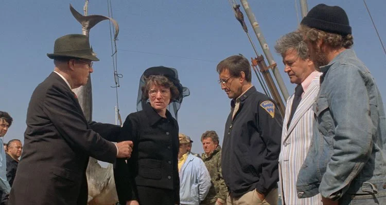 After the attack on the estuary victim, the grey t-shirt is even more exposed, meaning the truth is now undeniable and directed at Mayor Vaughn who hastly signs the contract that will allow the town to hire Quint (Robert Shaw) to kill the shark.