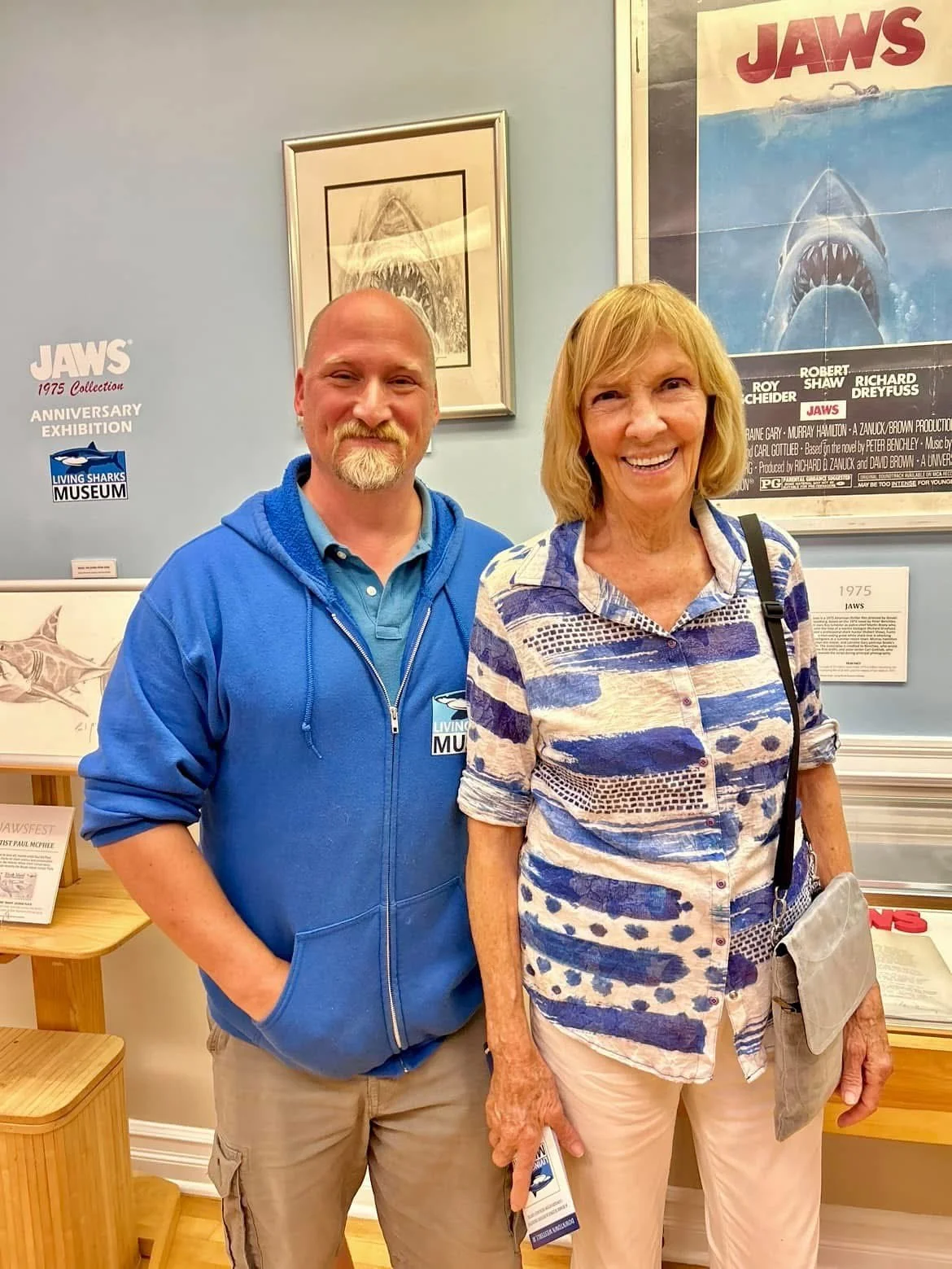 When Wendy Benchley finally made it into the exhibition, she enthusiastically remarked that even she “didn’t realize how much merch they actually made in the 70’s” until she saw it all in under one roof at Living Sharks Museum. “She was closely examining one of the shark tooth necklaces I had from 1975 still in its original packaging,” Cowley added. “I used that opportunity to open a drawer and show her a whole shark jaw still in its original packaging from Jaws 2, stating that by the time the sequel came out, they were selling real shark parts to promote the film... a testament to how people’s perspectives about sharks had shifted. She was moved by that.” There’s something to be said for all this shark history in one place. Benchley has been a supporter of Cowley’s work since their first interview together during the pandemic on In the Fighting Chair. She entrusted him to teach about sharks at her revival of the Peter Benchley Awards in 2025, and it was a natural progression to work together again to host her doc Jaws@50 at the United Theatre with Living Sharks Museum in Westerly, Rhode Island, just a town away from where she and Peter used to live. She hopes that the film Jaws inspires new generations to stand up for sharks.