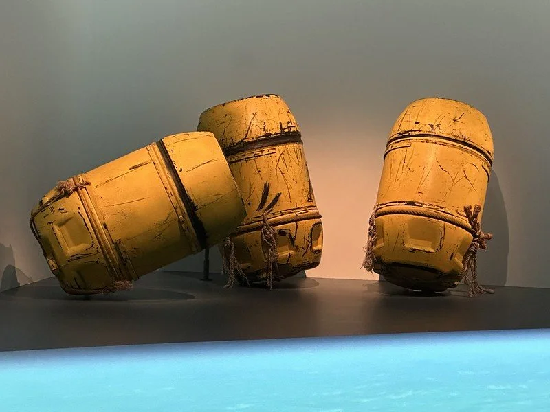 Also in the aquamarine-hued room are three of the surviving yellow barrels used for the movie to kept the shark buoyant, and to represent the shark itself when the mechanical prop failed; which only added to the movie’s suspense. Near the Orca’s display’s stern, we also see Hooper’s banged-up cage used in the film, which is autographed by actor Richard Dreyfuss and stuntman Dick Warlock, who doubled for Hooper in some of the cage sequences as Hooper unsuccessfully attempts to inject a fatal dose of poison into the shark’s tough hide. I saw this very cage on display once in an art museum on Catalina Island seven years ago, and it was exactly as I remembered it.